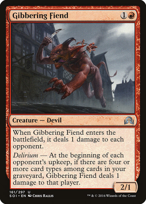 Shadows over InnistradEn stockWhen Gibbering Fiend enters the battlefield, it deals 1 damage to each opponent. Delirium — At the beginning of each opponent's upkeep, if there ar...
