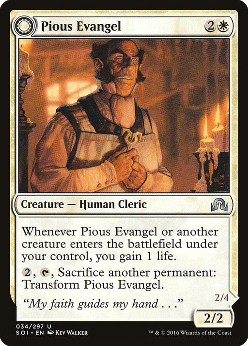 Shadows over InnistradEn stockWhenever Pious Evangel or another creature enters the battlefield under your control, you gain 1 life. {2}, {T}, Sacrifice another permanent: Trans...