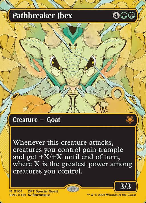 Special GuestsRupture de stockWhenever Pathbreaker Ibex attacks, creatures you control gain trample and get +X/+X until end of turn, where X is the greatest power among creature...