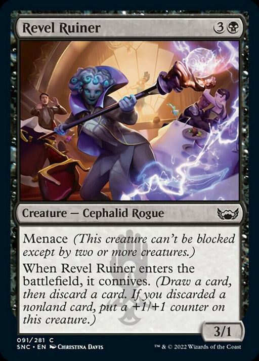 Streets of New CapennaEn stockMenace (This creature can't be blocked except by two or more creatures.) When Revel Ruiner enters the battlefield, it connives. (Draw a card, then ...