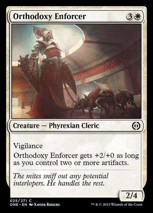 Phyrexia: All Will Be OneEn stockVigilance Orthodoxy Enforcer gets +2/+0 as long as you control two or more artifacts.