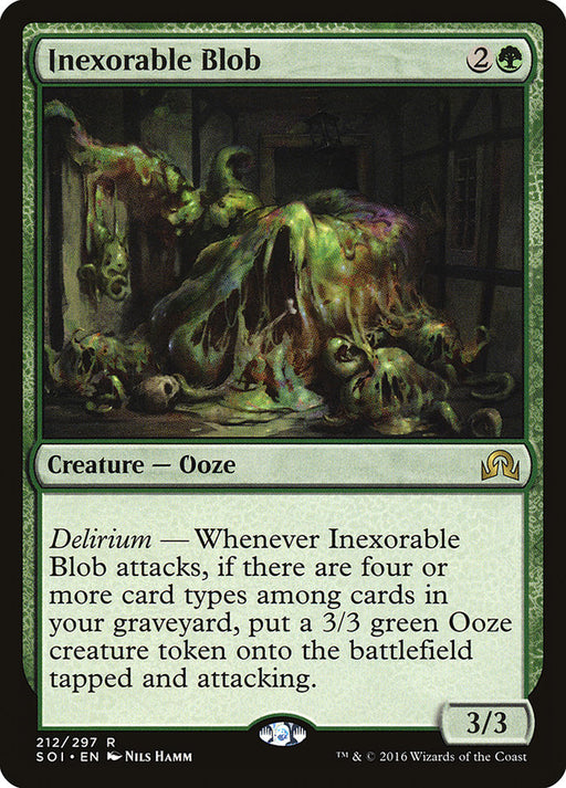 Shadows over InnistradEn stockDelirium — Whenever Inexorable Blob attacks, if there are four or more card types among cards in your graveyard, create a 3/3 green Ooze creature t...