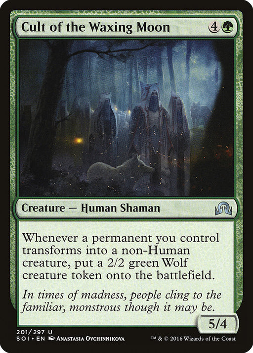 Shadows over InnistradEn stockWhenever a permanent you control transforms into a non-Human creature, create a 2/2 green Wolf creature token.