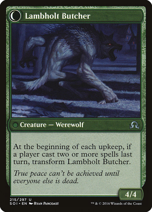 Shadows over InnistradEn stockAt the beginning of each upkeep, if a player cast two or more spells last turn, transform Lambholt Butcher.