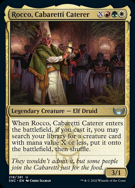 Streets of New CapennaStock basWhen Rocco, Cabaretti Caterer enters the battlefield, if you cast it, you may search your library for a creature card with mana value X or less, pu...
