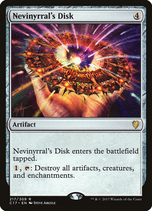 Commander 2017Rupture de stockNevinyrral's Disk enters the battlefield tapped. {1}, {T}: Destroy all artifacts, creatures, and enchantments.