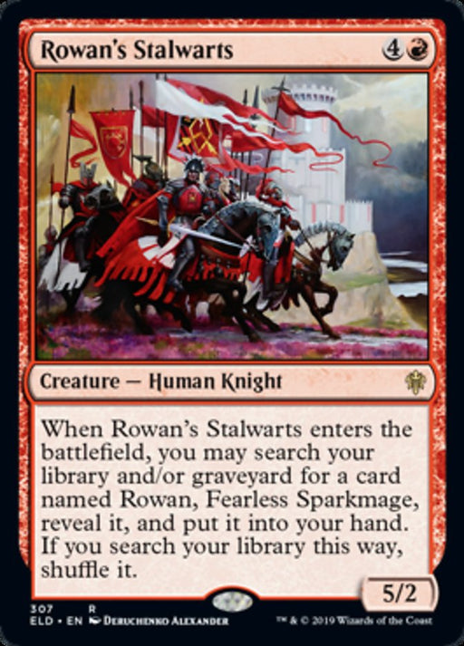 Throne of EldraineStock basWhen Rowan's Stalwarts enters the battlefield, you may search your library and/or graveyard for a card named Rowan, Fearless Sparkmage, reveal it, ...