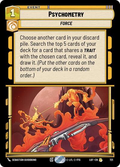 Legends of the ForceStock basChoose another card in your discard pile. Search the top 5 cards of your deck for a card that shares a trait with the chosen card, reveal it, and d...