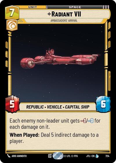 Jump to LightspeedStock basEach enemy non-leader unit gets -1/-0 for each damage on it. When Played: Deal 5 indirect damage to a player.