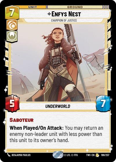 Twilight of the RepublicStock basSaboteur When Played/On Attack: You may return an enemy non-leader unit with less power than this unit to its owner’s hand.