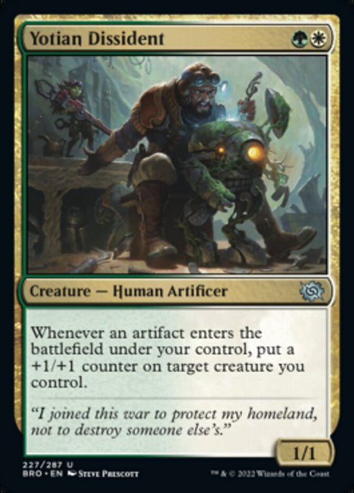 The Brothers' WarStock basWhenever an artifact enters the battlefield under your control, put a +1/+1 counter on target creature you control.