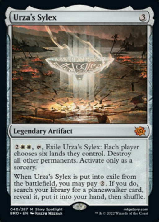 The Brothers' WarRupture de stock{2}{W}{W}, {T}, Exile Urza's Sylex: Each player chooses six lands they control. Destroy all other permanents. Activate only as a sorcery. When Urza...