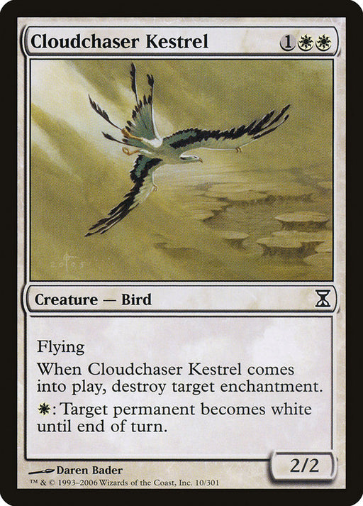 Time SpiralEn stockFlying When Cloudchaser Kestrel enters the battlefield, destroy target enchantment. {W}: Target permanent becomes white until end of turn.