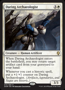 Whenever you cast a historic spell, put a +1/+1 counter on Daring Archaeologist. (Artifacts, legendaries, and Sagas are historic.)