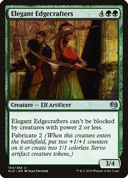 Elegant Edgecrafters can't be blocked by creatures with power 2 or less.