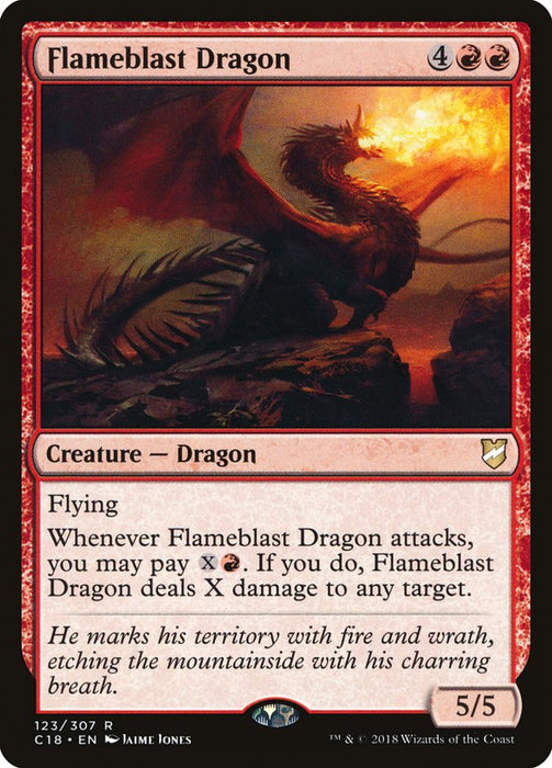 Whenever Flameblast Dragon attacks, you may pay {X}{R}. If you do, Flameblast Dragon deals X damage to any target.