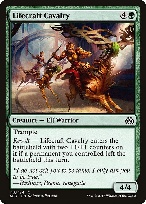 Revolt — Lifecraft Cavalry enters the battlefield with two +1/+1 counters on it if a permanent you controlled left the battlefield this turn.