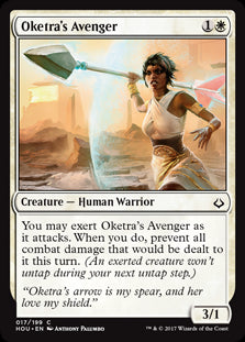 You may exert Oketra's Avenger as it attacks. When you do, prevent all combat damage that would be dealt to it this turn. (An exerted creature won't untap during your next untap step.)