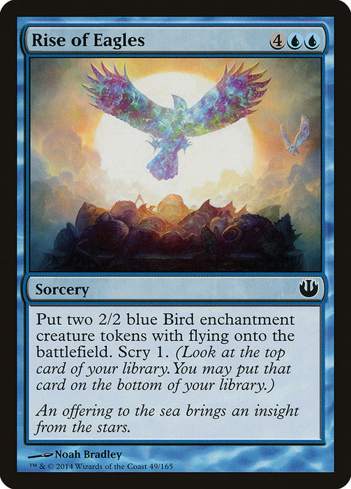 Create two 2/2 blue Bird enchantment creature tokens with flying. Scry 1. (Look at the top card of your library. You may put that card on the bottom of your library.)