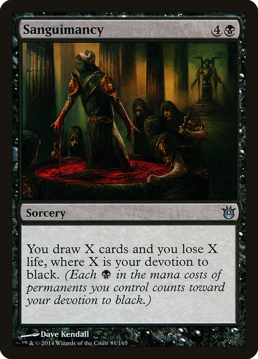You draw X cards and you lose X life, where X is your devotion to black. (Each {B} in the mana costs of permanents you control counts toward your devotion to black.)
