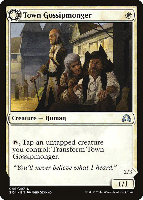 {T}, Tap an untapped creature you control: Transform Town Gossipmonger.