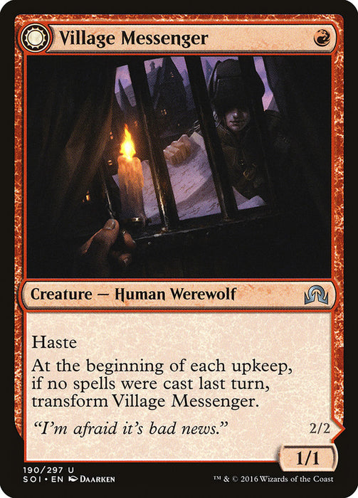 At the beginning of each upkeep, if no spells were cast last turn, transform Village Messenger.