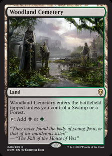 Woodland Cemetery enters the battlefield tapped unless you control a Swamp or a Forest.